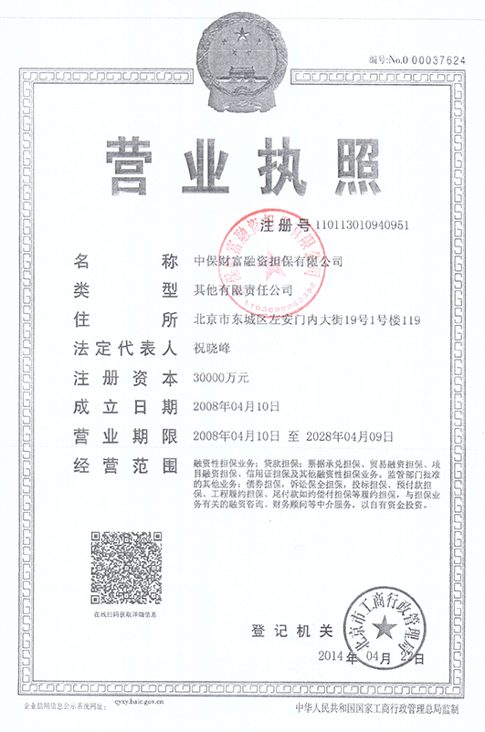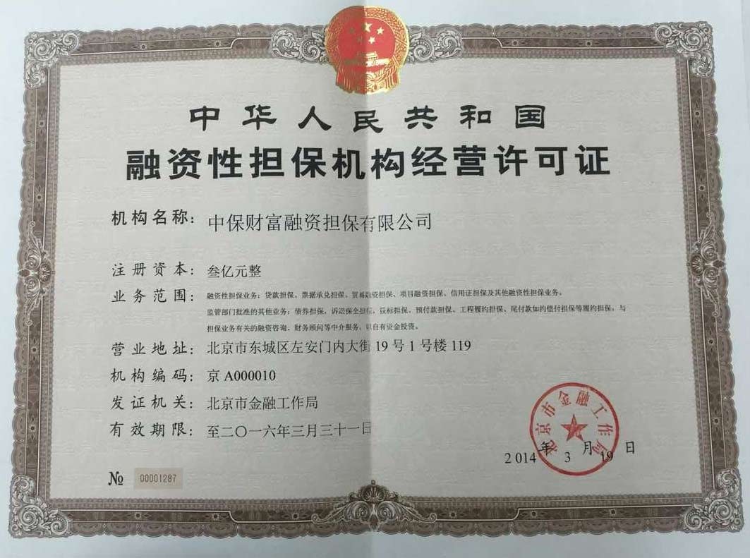 中保财富融资担保有限公司(以下简称公司)是经北京市金融局、国家工商行政管理总局批准,在北京市工商管理局注册成立的融资性担保公司。公司注册资金为3亿元人民币,主要从事贷款担保、票据承兑担保、票据承兑担保、项目融资担保、信用证担保债券担保、诉讼保全担保、投标担保、预付款担保、工程履约担保、尾付款如约偿付担保等履约担保及其他融资性担保业务。