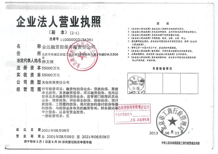 金达融资担保有限责任公司成立于2001年,注册资金为5.5亿元人民币,具有北京市金融工作局颁发的五年期“融资性担保机构经营许可证”。
